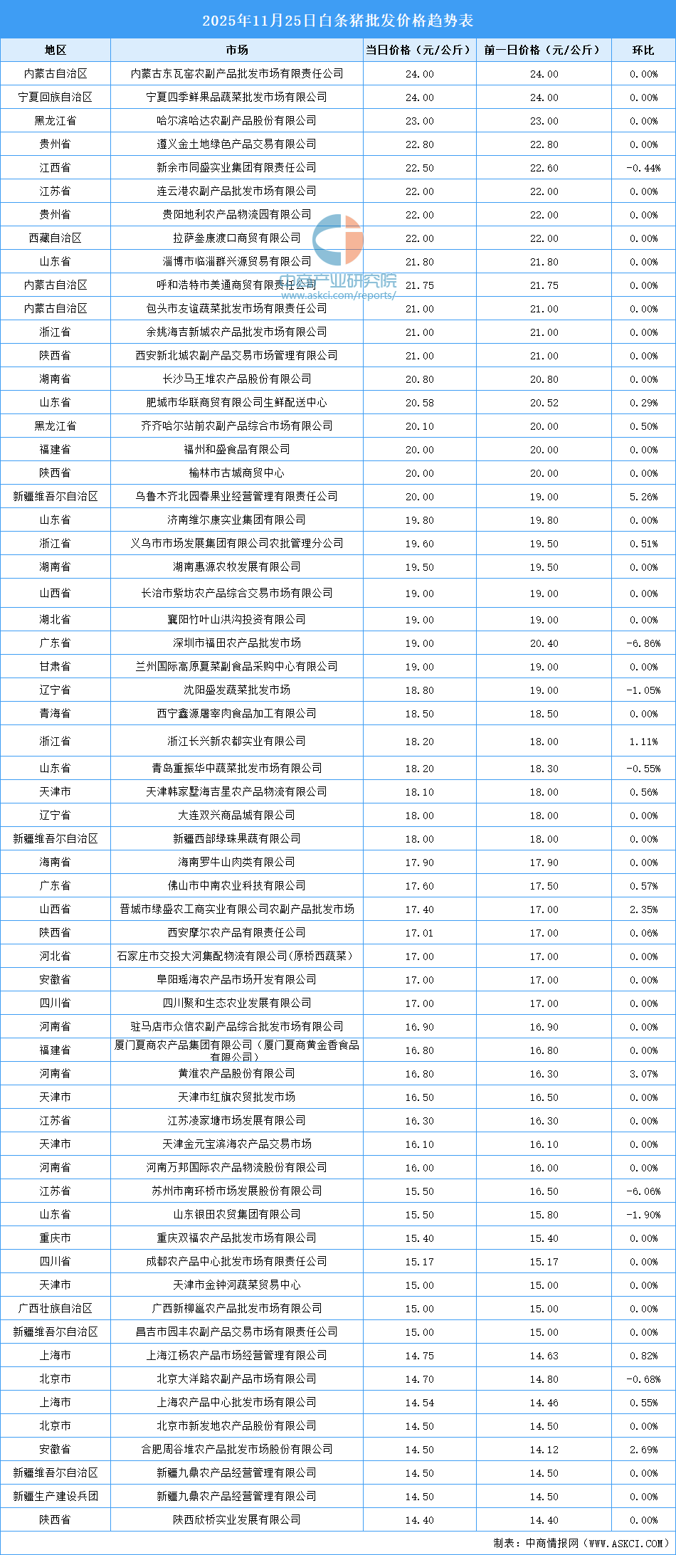 电子游艺官网讯:最新数据显示:11月25日全国白条猪平均价格为18.26元/公斤。其中,白条猪价格最高的市场是内蒙古东瓦窑农副产品批发市场有限责任公司、宁夏四季鲜果品蔬菜批发市场有限公司,当日价格均为24.00元/公斤。白条猪价格最低的是陕西欣桥实业发展有限公司,当日价格为14.40元/公斤,环比持平。