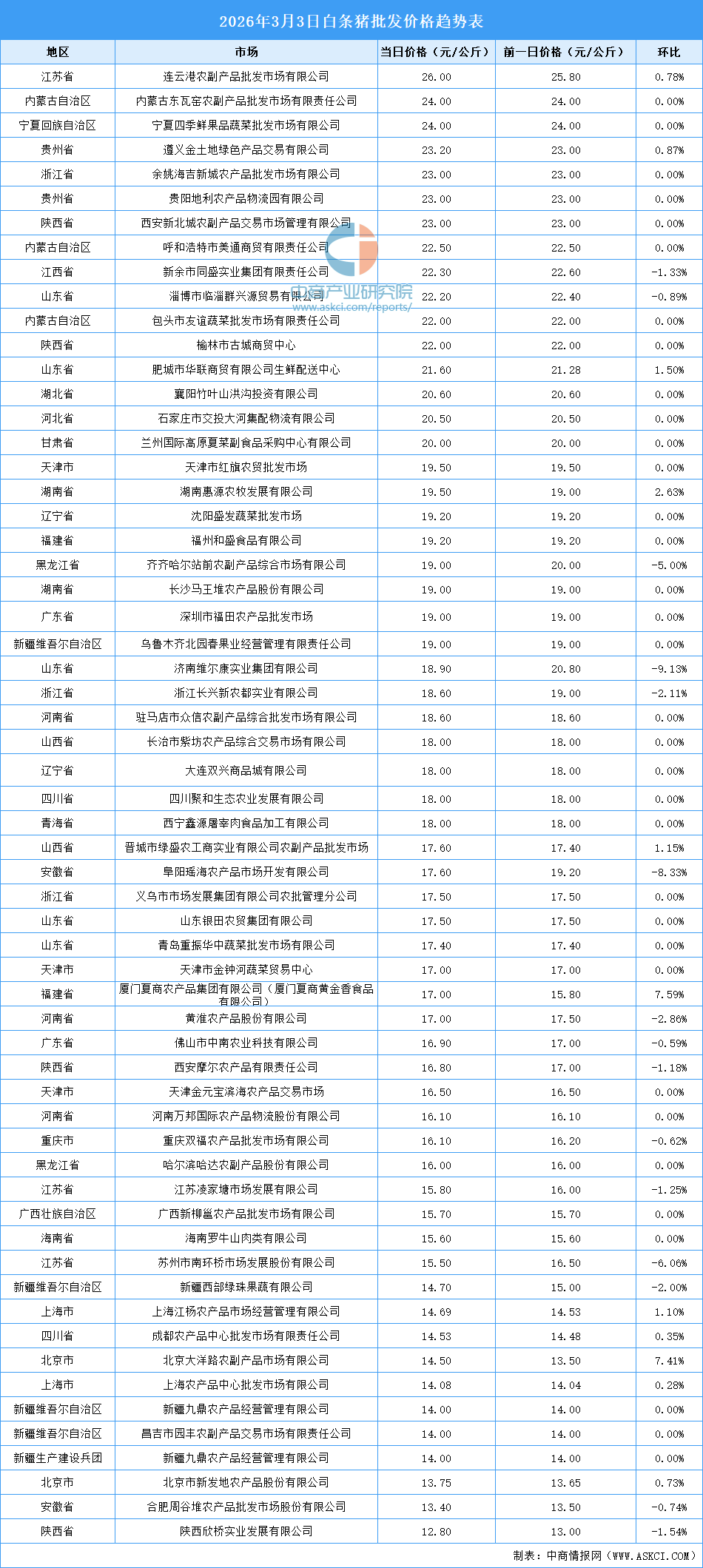 电子游艺官网讯:最新数据显示:3月3日全国白条猪平均价格为18.26元/公斤。其中,白条猪价格最高的市场是连云港农副产品批发市场有限公司,当日价格为26.00元/公斤,环比上涨0.78%。白条猪价格最低的是陕西欣桥实业发展有限公司,当日价格为12.80元/公斤,环比下跌1.54%。