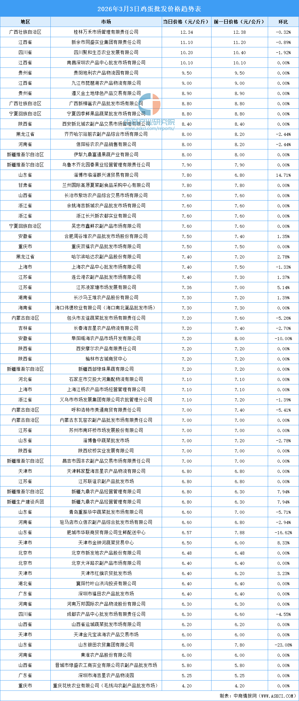 电子游艺官网讯:最新数据显示:3月3日全国鸡蛋平均价格为7.36元/公斤。其中,鸡蛋价格最高的市场是桂林万禾市场管理有限责任公司,当日价格为12.34元/公斤,环比下跌0.32%。鸡蛋价格最低的市场是重庆花枝农业有限公司(毛线沟农副产品批发市场),当日价格为4.20元/公斤,环比持平。