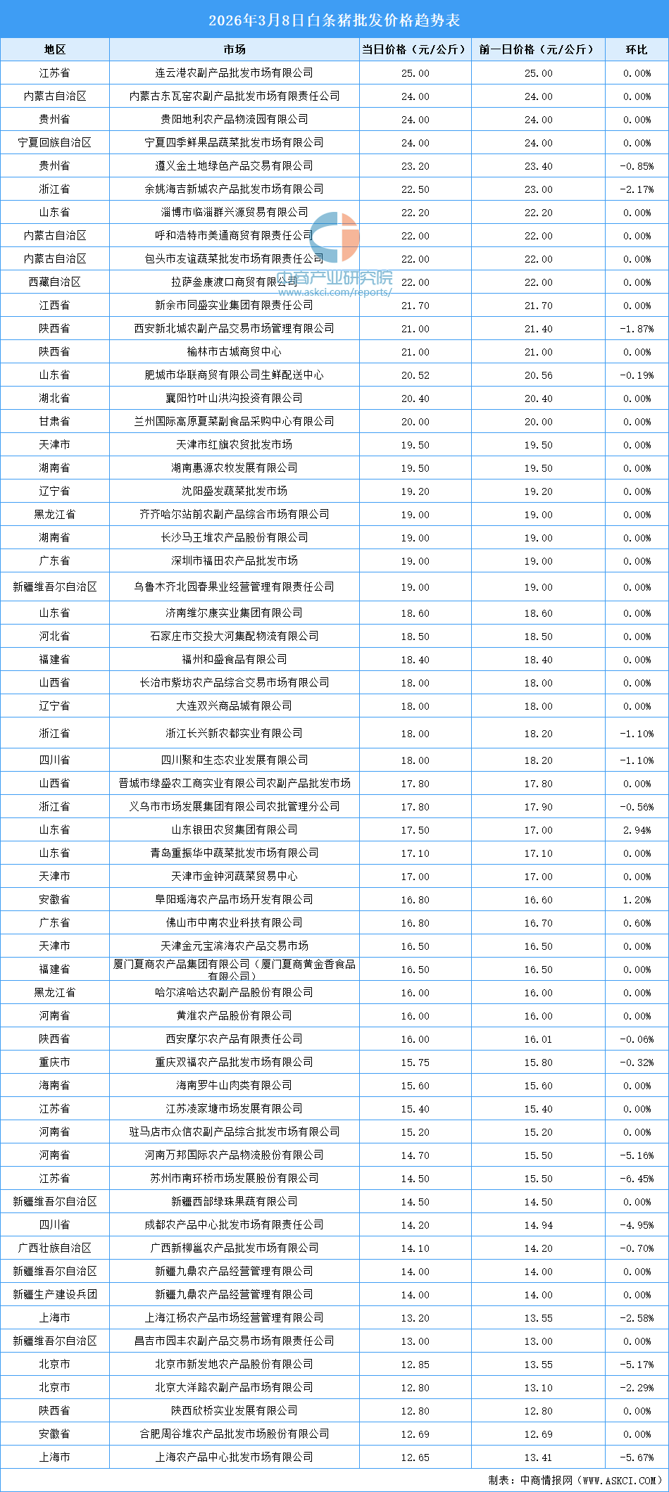 电子游艺官网讯:最新数据显示:3月8日全国白条猪平均价格为17.85元/公斤。其中,白条猪价格最高的市场是连云港农副产品批发市场有限公司,当日价格为25.00元/公斤,环比持平。白条猪价格最低的是上海农产品中心批发市场有限公司,当日价格为12.65元/公斤,环比下跌5.67%。