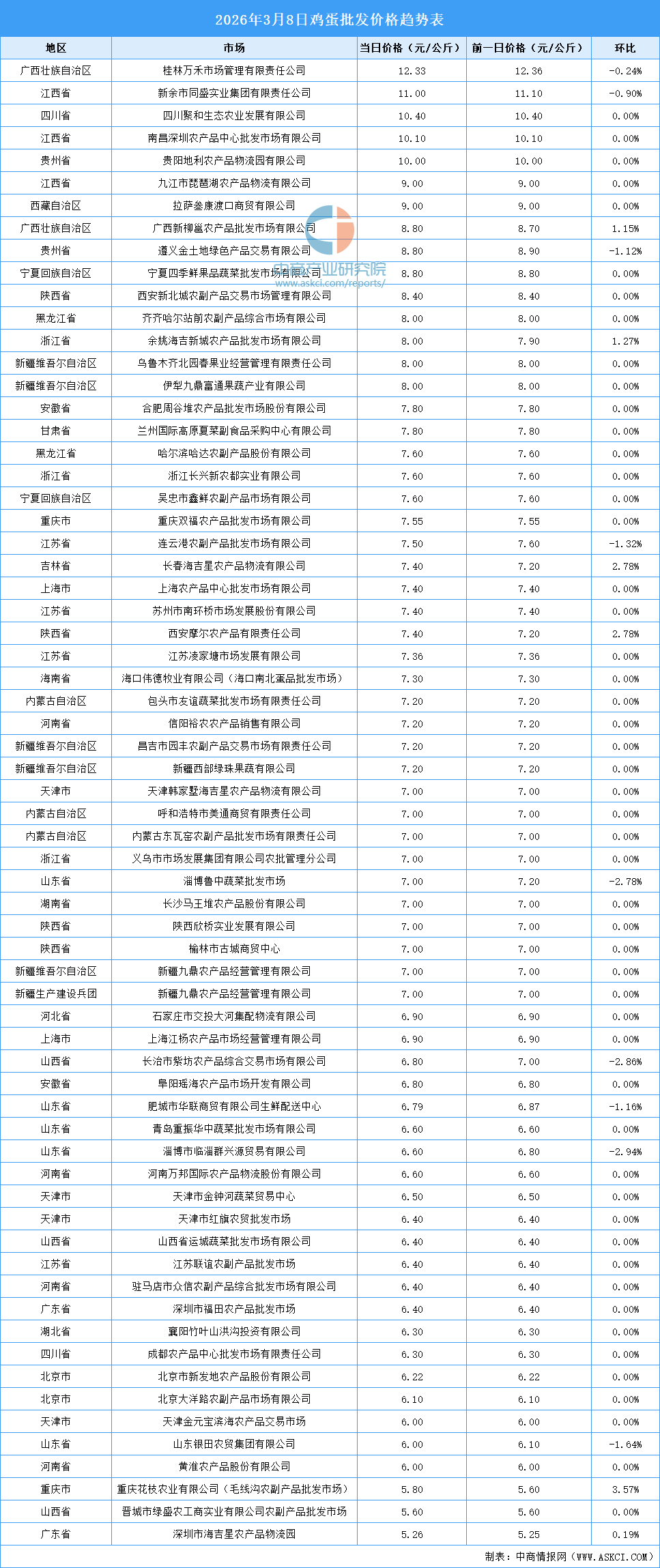 电子游艺官网讯:最新数据显示:3月8日全国鸡蛋平均价格为7.38元/公斤。其中,鸡蛋价格最高的市场是桂林万禾市场管理有限责任公司,当日价格为12.33元/公斤,环比下跌0.24%。鸡蛋价格最低的市场是深圳市海吉星农产品物流园,当日价格为5.26元/公斤,环比上涨0.19%。